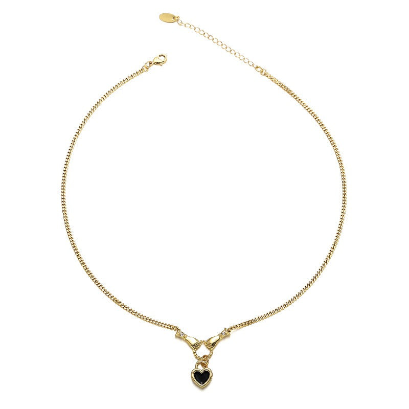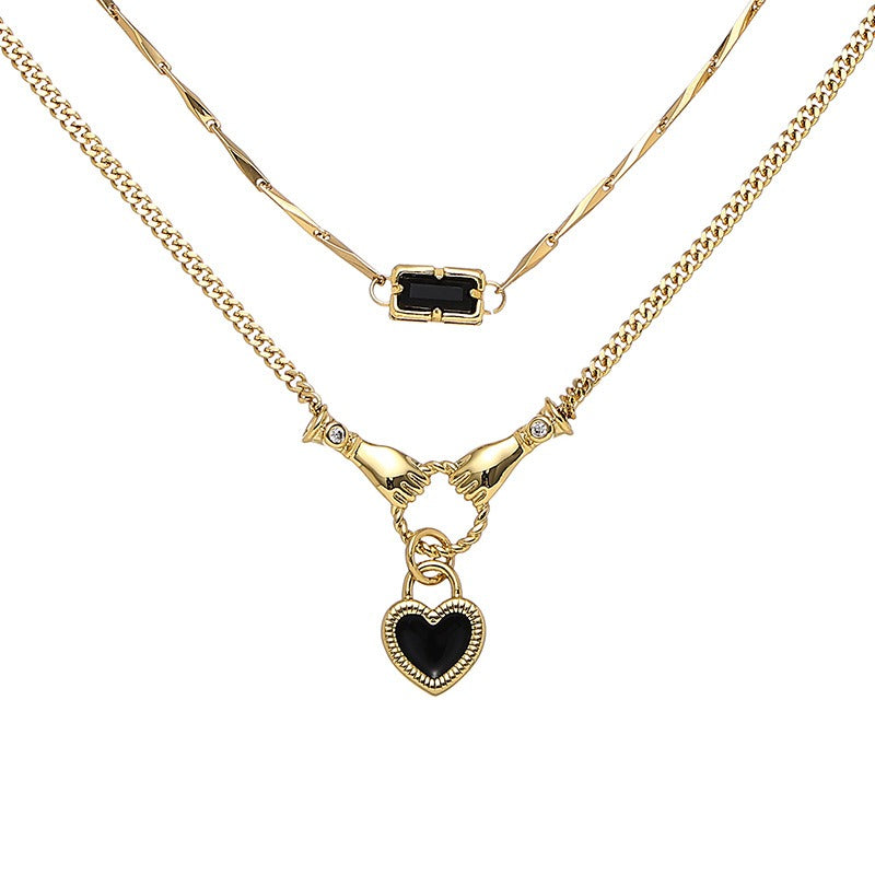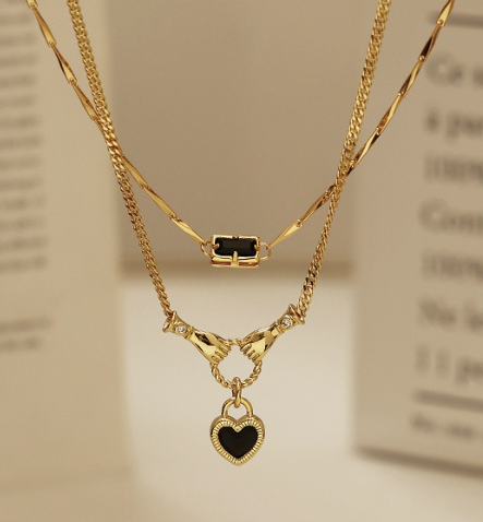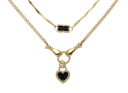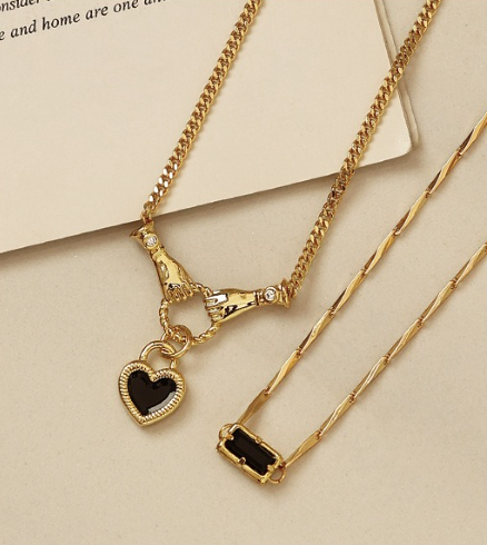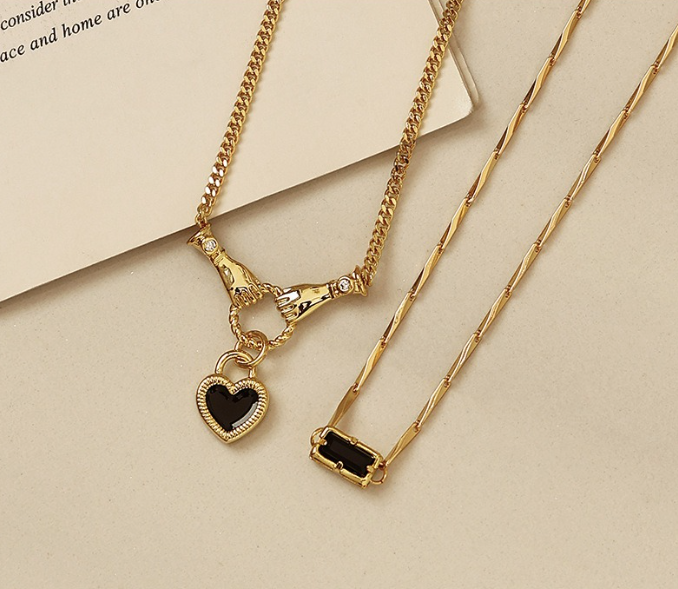 The black zircon necklace duo features two designs with black zircon pendants. The first design is a smooth chain design with a black zircon rectangle pendant. The second design is a smooth chain design with hands holding and a heart lock. Sold separately, but pairs perfectly together.