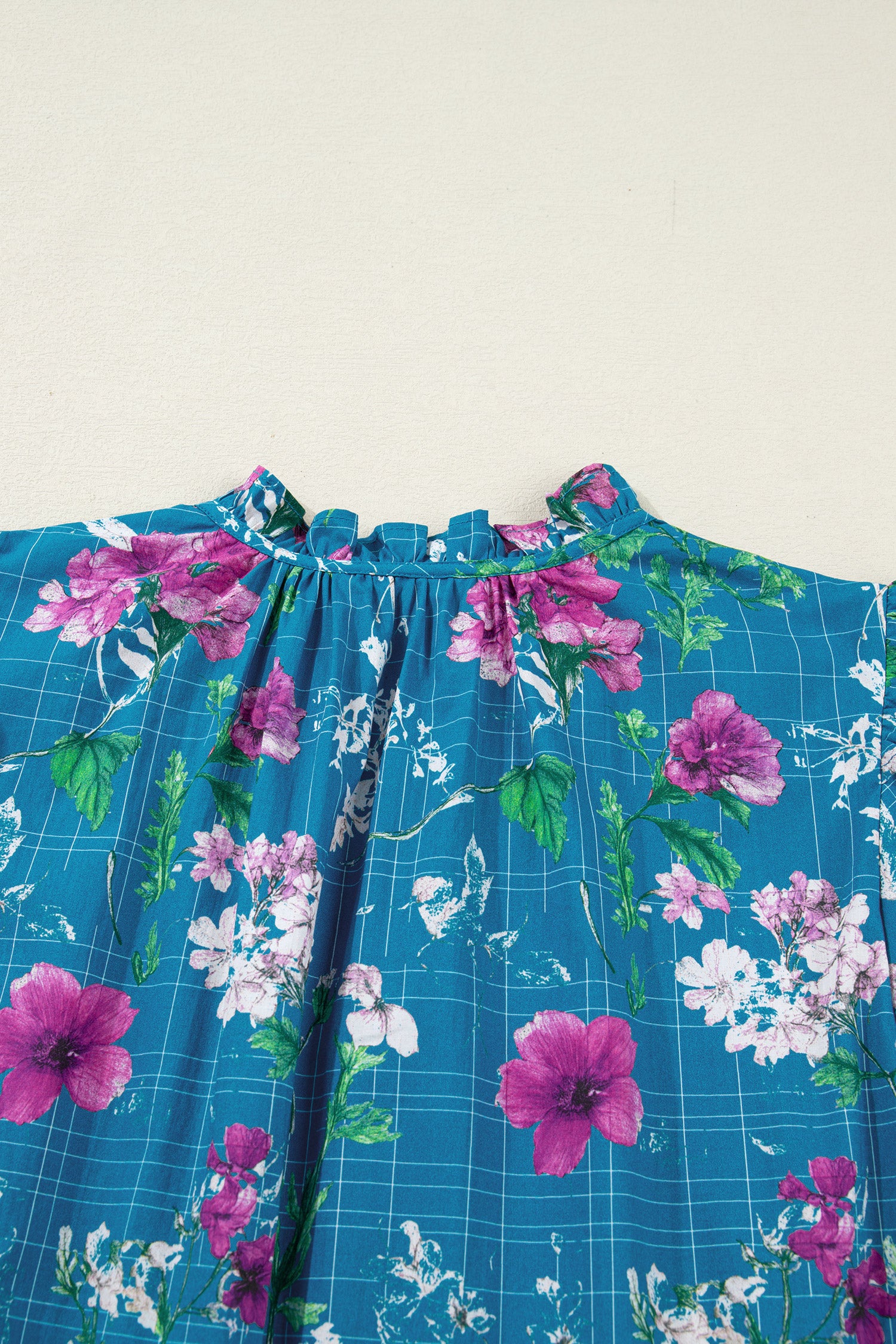 Blue Floral Flutter Sleeve Button Tie Split Neck Belted Long Dress