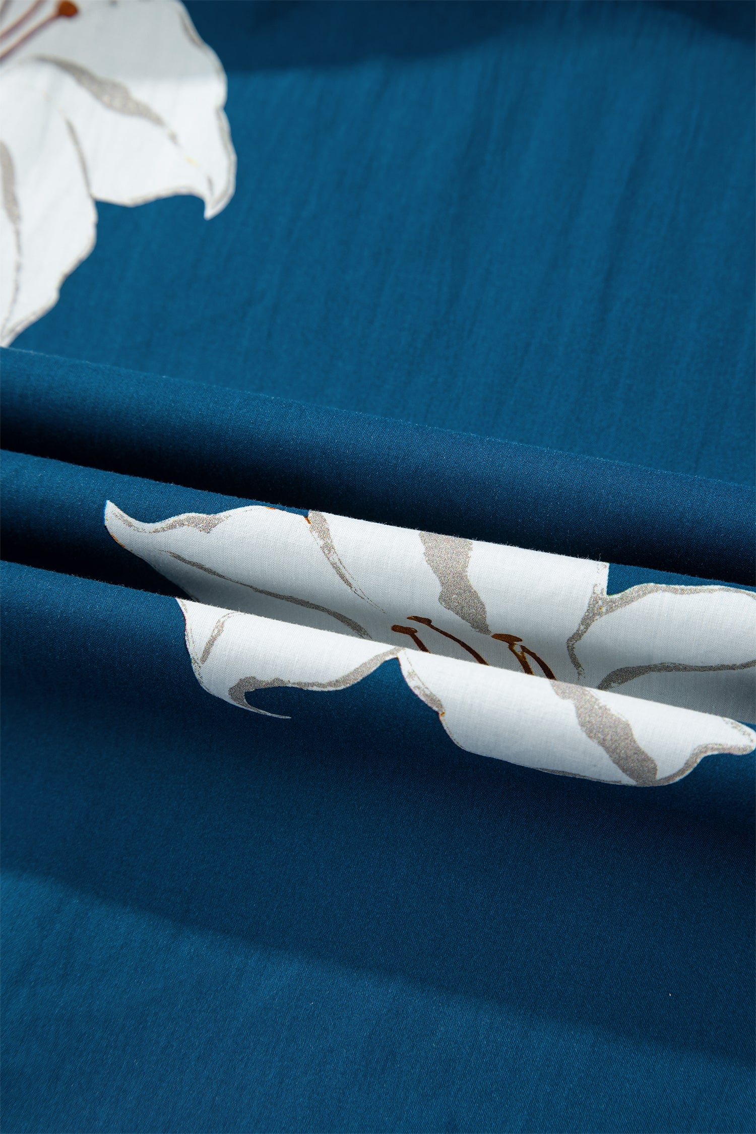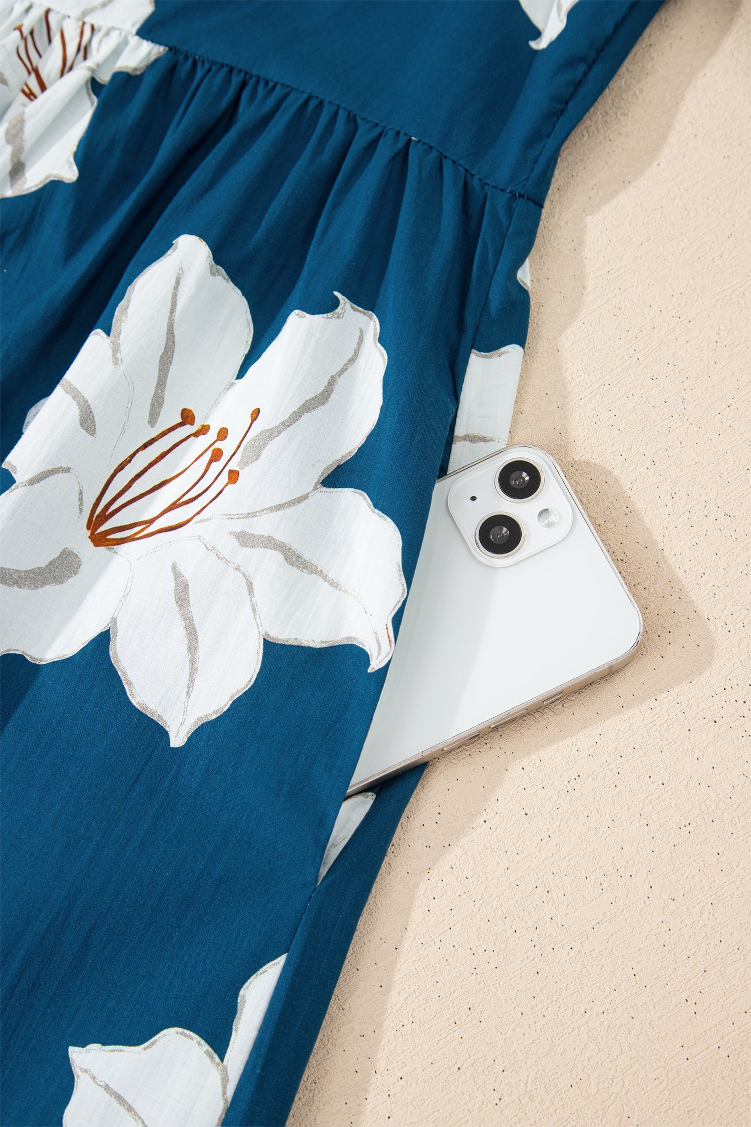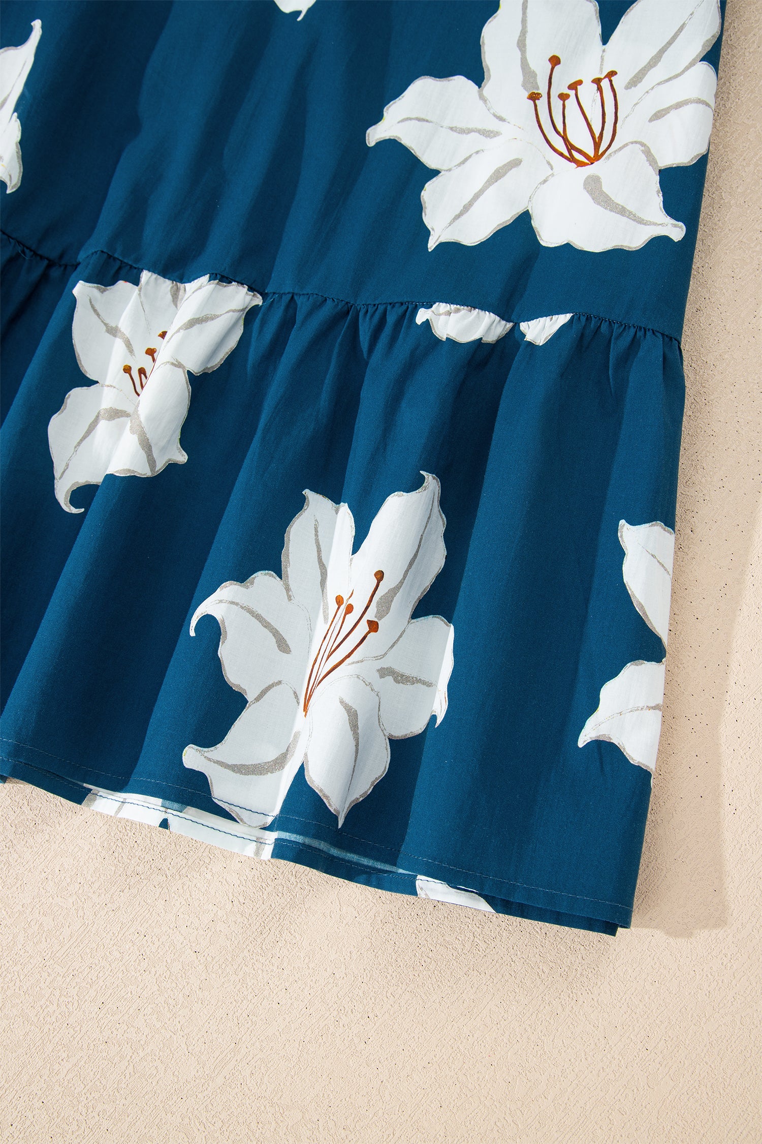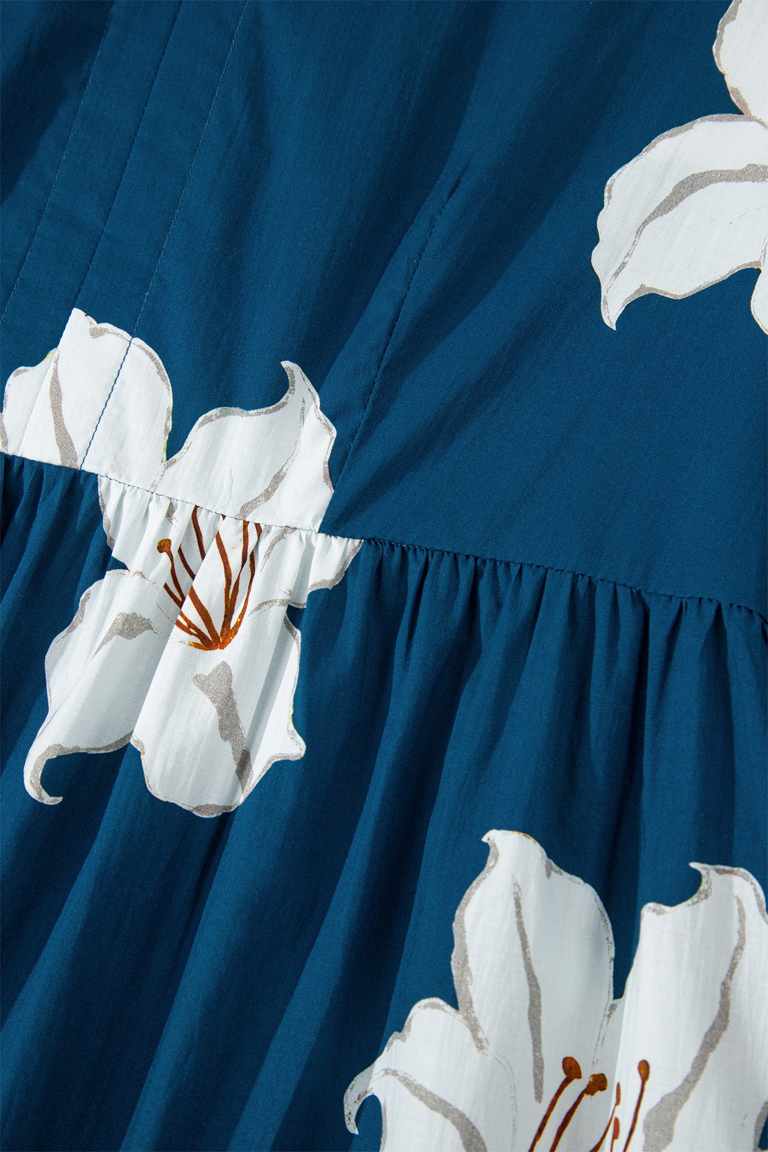 Blue Floral Print Shirt Collar V Neck 3/4 Sleeve Shift Midi Dress