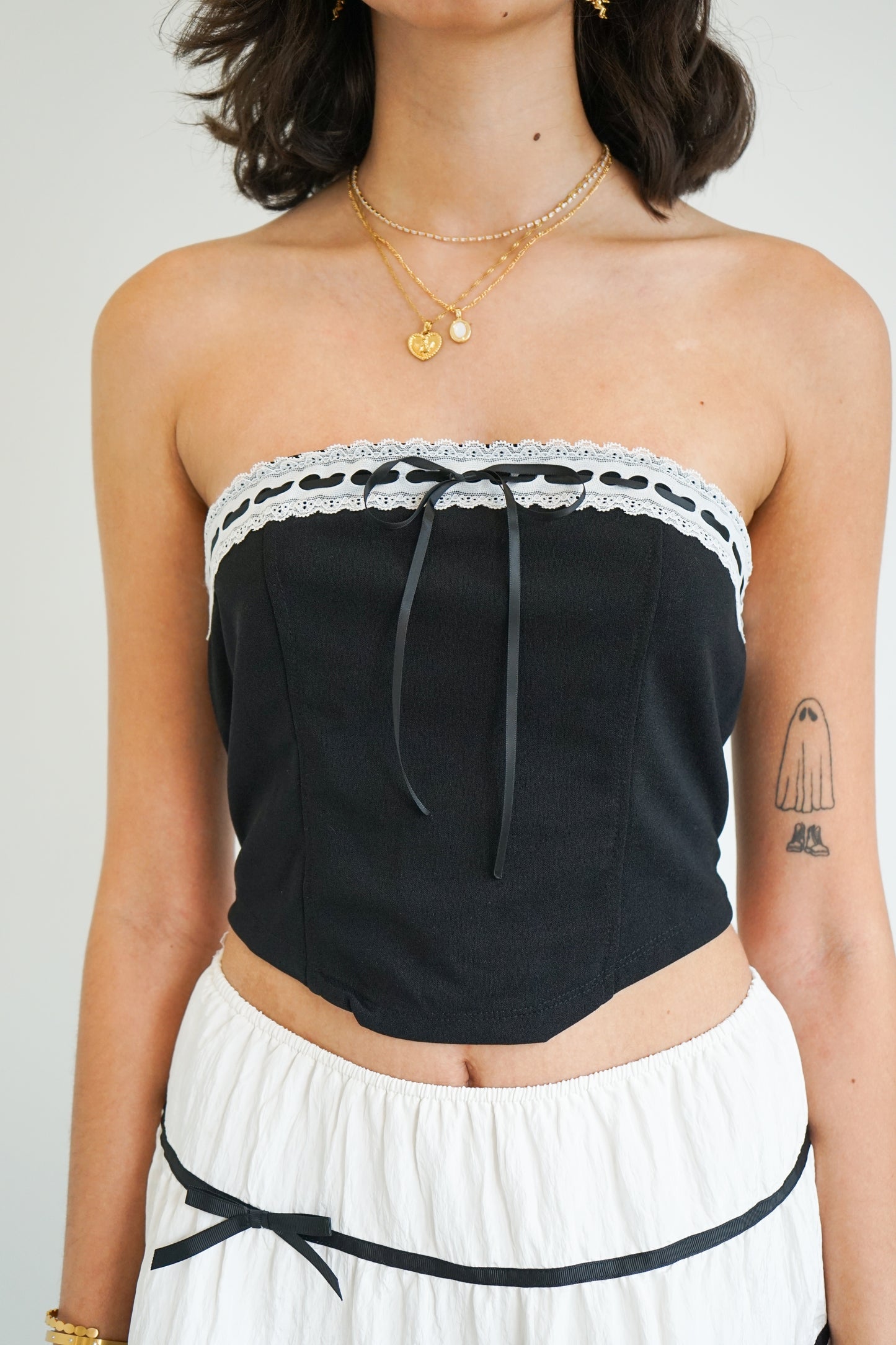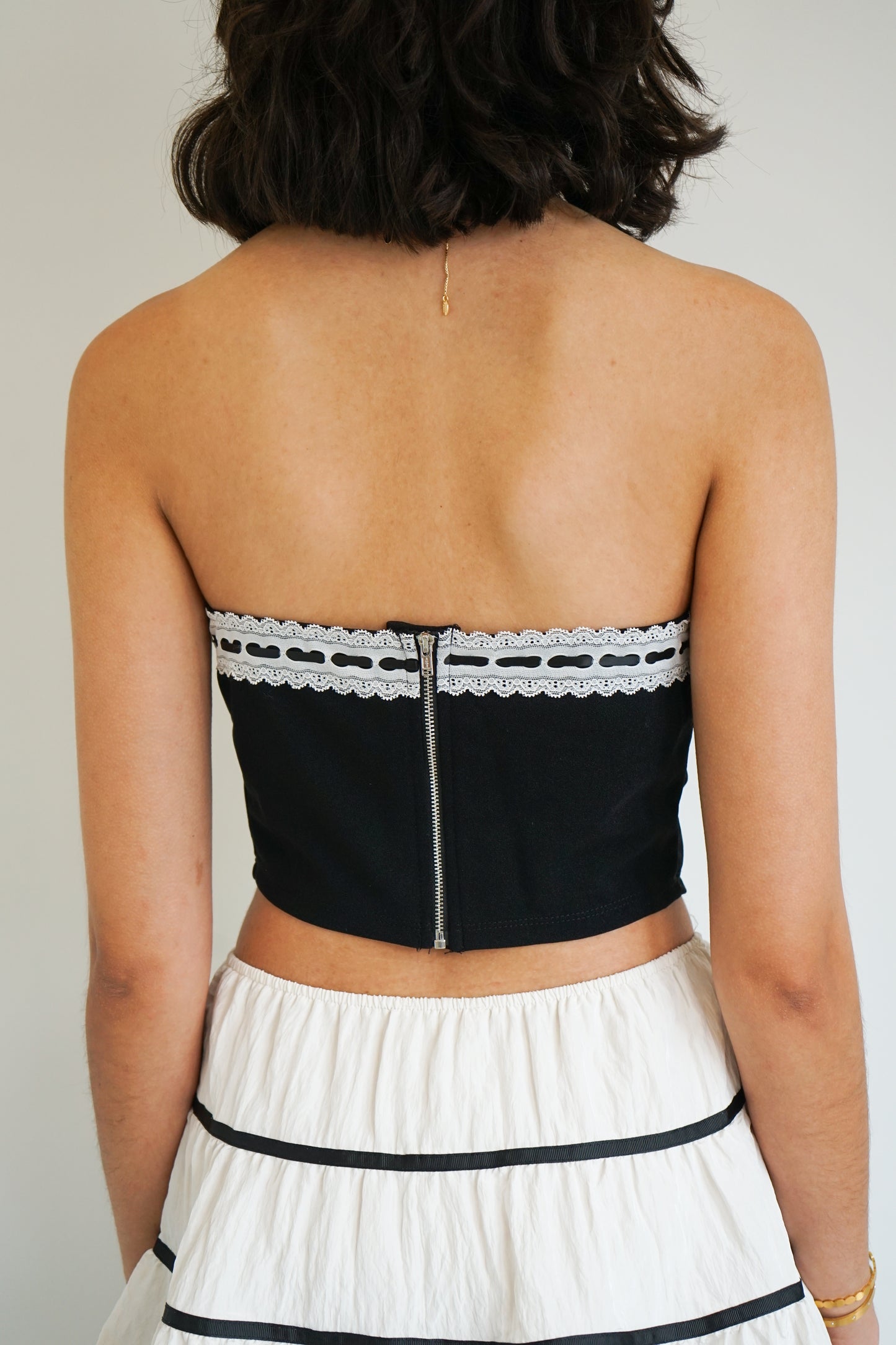 The Clara Tube top is a black strapless tube top with a white lace trim. Black ribbon adjustable across the chest. Zipper closure in the back. Pair with our Juliette Skirt to complete the look. Super comfortable and breathable material. Beautiful, feminine design. Dress up or down, very versatile.