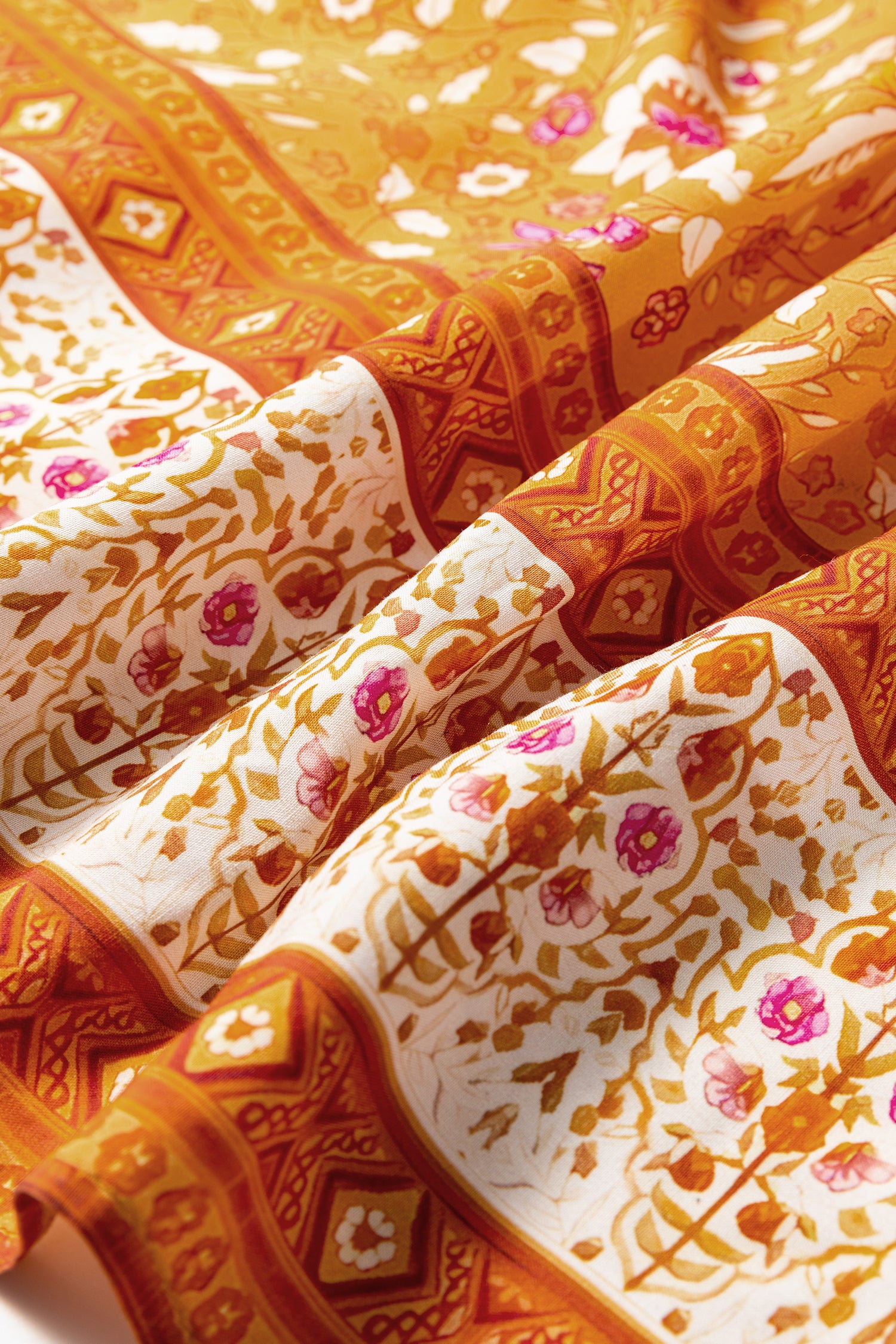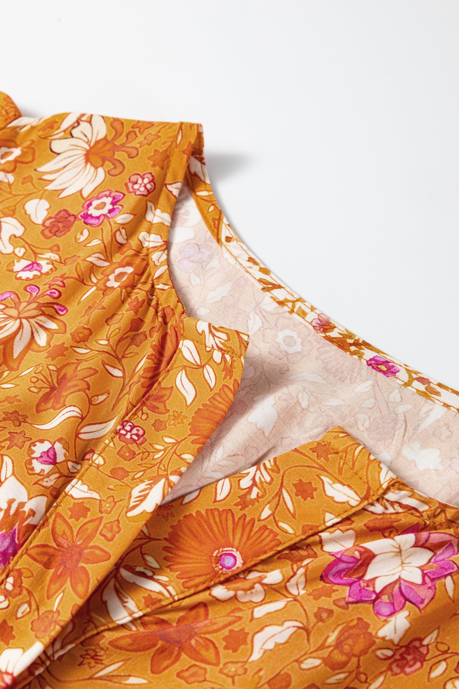Orange Floral Print Smocked Waist Long Sleeve Boho Maxi Dress
