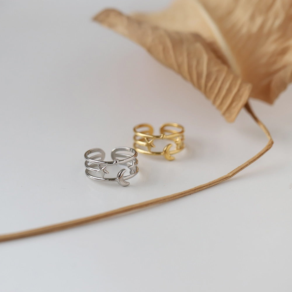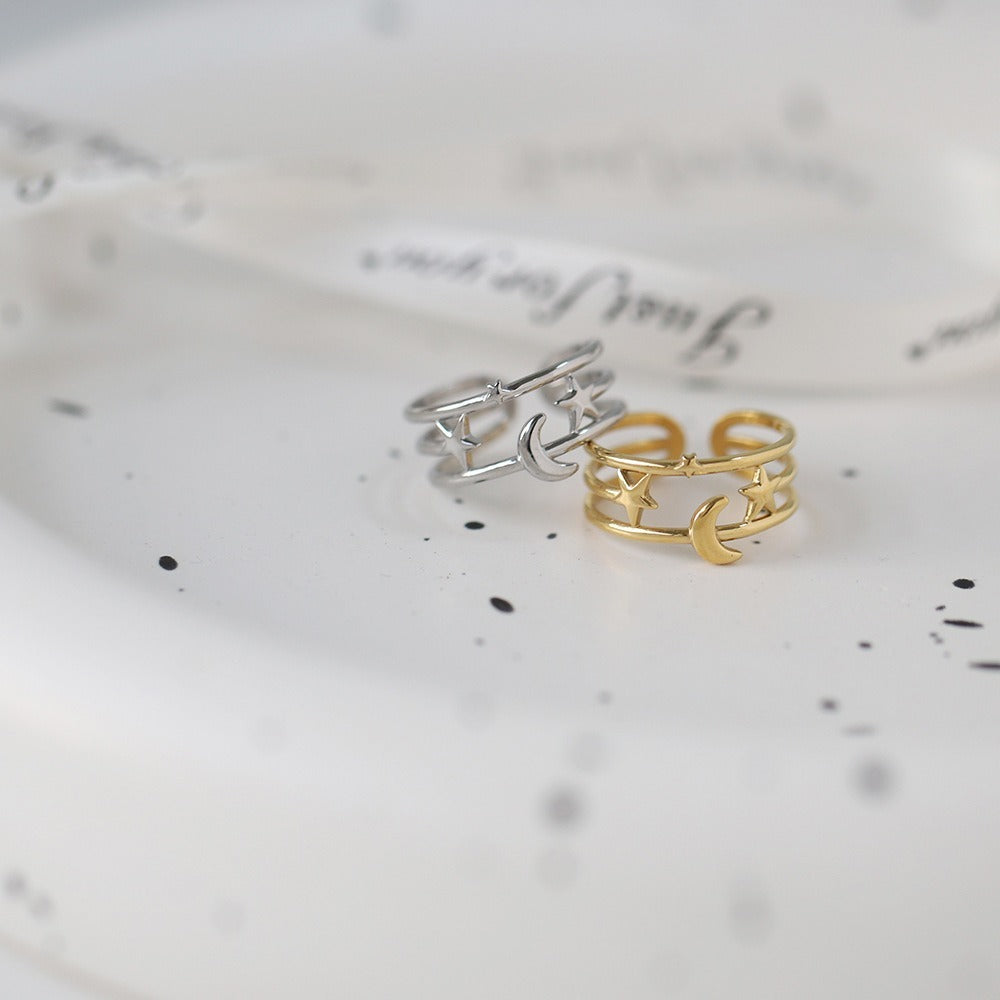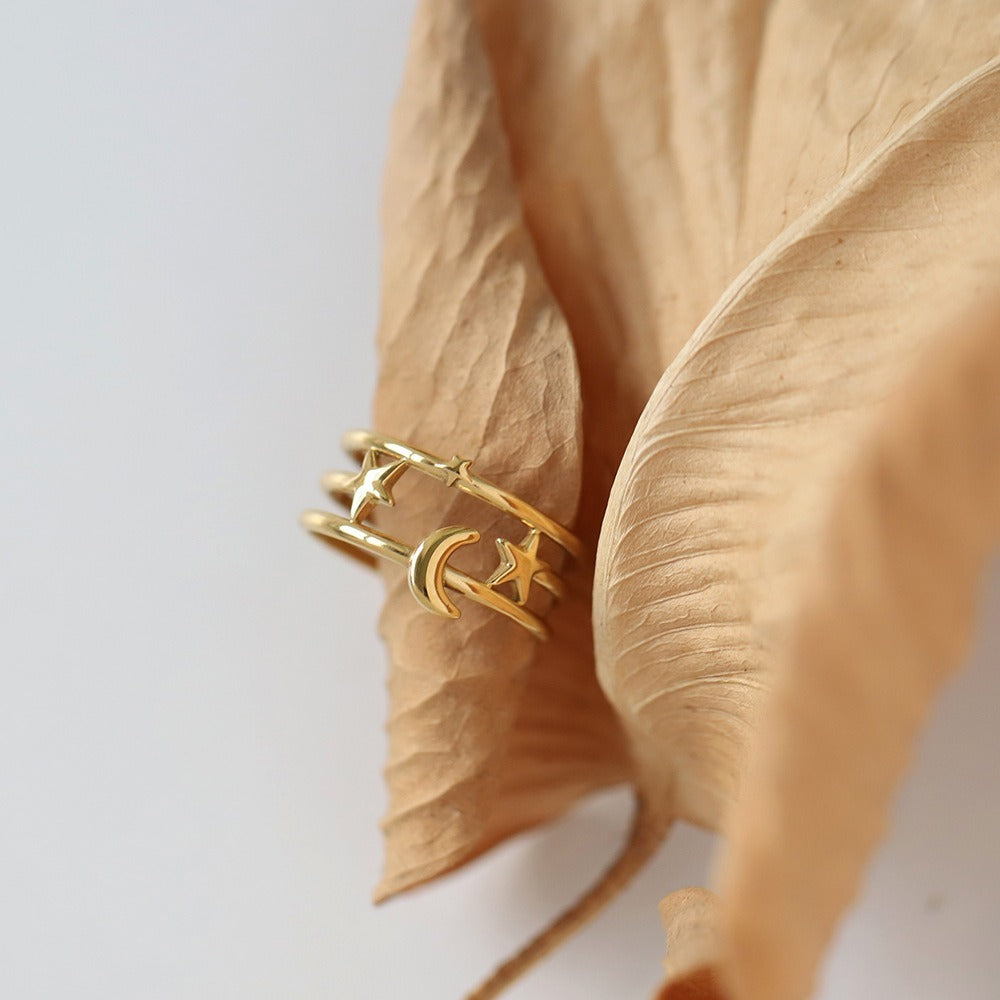 The starry night ring is beautiful addition to your jewelry collection. A three layer design with two stars and one moon. Comes in gold and silver to match your desired aesthetic. Pair with other SOCALI jewelry to complete the look. Perfect for your everyday wardrobe or a night out.