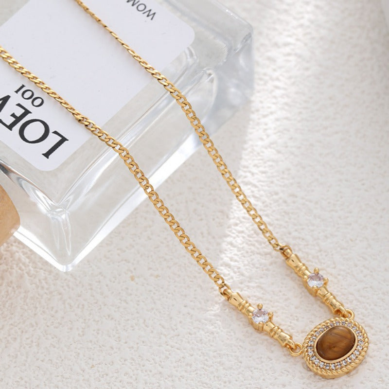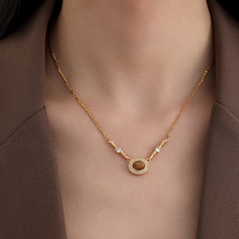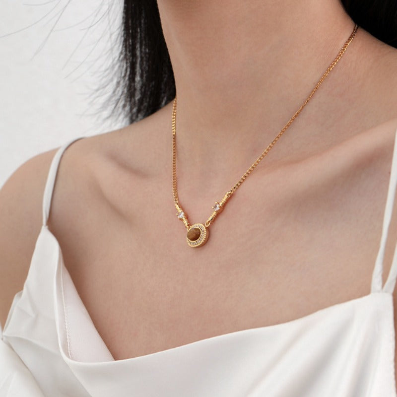 The tigers eye pedant necklace is the perfect addition to your jewelry collection. With a 18k gold plated stainless steel chain and zircon detailing, it will shine under the sunlight and dazzle in the moonlight. Stack with other SOCALI necklaces to complete the look.