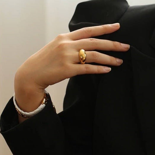 One of our favorite rings in our collection! This thick rounded tube ring is versatile with all kinds of style. This bold statement ring is guaranteed to up your fashion game. This style must-have is the perfect addition to make you feel & look like a millions bucks. This gold-plated beauty will definitely will be a trend that never goes out of style.