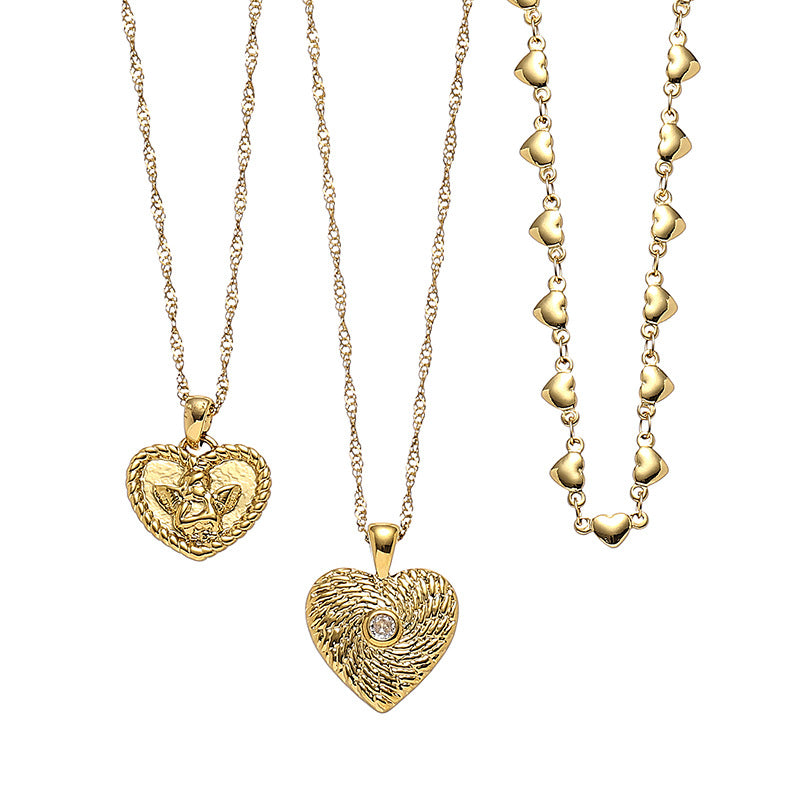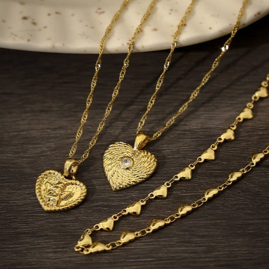 The Zircon Inlaid Heart Necklace Collection are three different designs of necklaces. The first design is an angel heart pendant with an 18k gold plated chain. The second is a beautiful heart pendant with a zircon swirl design. The third is a repeating heart chain. Buy all together for a stacked look!